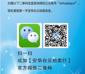 关于我司微信公众账号(anhuabaiyun),或扫描下列二维码,进入微展厅—点击“拍品中心”查看拍品图片、起拍价格。