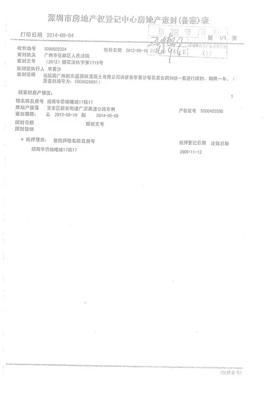 深圳市宝安区新安街道招商华侨城曦城17栋17号房[拍卖号:(2015)穗花法委拍字第53号、案号:(2012)穗花法执字第1719号]。建筑面积:355.09平方米,起拍价:14,771,744元;保证金:1,470,000元。
